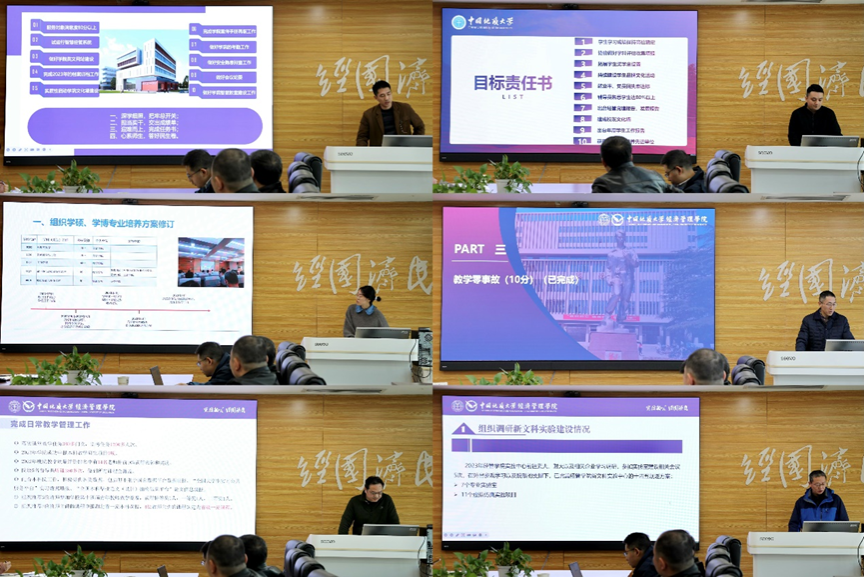 会上,统计学系、金融与贸易系、会计系、旅游管理系、经济学系、管理科学与工程系、工商管理系系主任分别从党建工作、教学、科研、人才引进、专业与团队建设等方面工作进展进行详细汇报,并分析了自身存在的问题和下一步工作思路。随后,公司综合事务办公室、研究生教育办公室、旗下产业办公室、德育工作组、专硕教育中心和实验教学中心科室负责人从2023年度目标工作责任完成情况、工作不足之处以及未来展望等方面作了工作汇报。