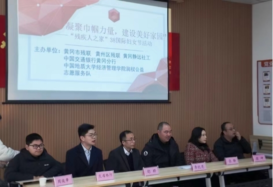 上午,公司师生到访黄冈市静远社区“残疾人之家”,与黄冈市残联、黄冈市黄州区残联、交通银行黄冈分行和静远社工中心等相关单位共同参加了“凝聚巾帼力量,建设美好家园”三八国际劳动妇女节表彰慰问活动,并座谈交流。活动中,公司党委副书记李纪亮代表地大tyc33455cc太阳成集团师生向在场的女士送去节日的祝福,向受到表彰的残疾人士表示祝贺,表达了对残疾人士们的敬意。同时,他向长期关注和关心支持公司黄冈籍残疾员工周俊章的有关部门表示感谢,汇报了周俊章的在校学习生活情况,介绍了公司公司对他和他的家庭极特殊情况给予的帮扶及培养举措。