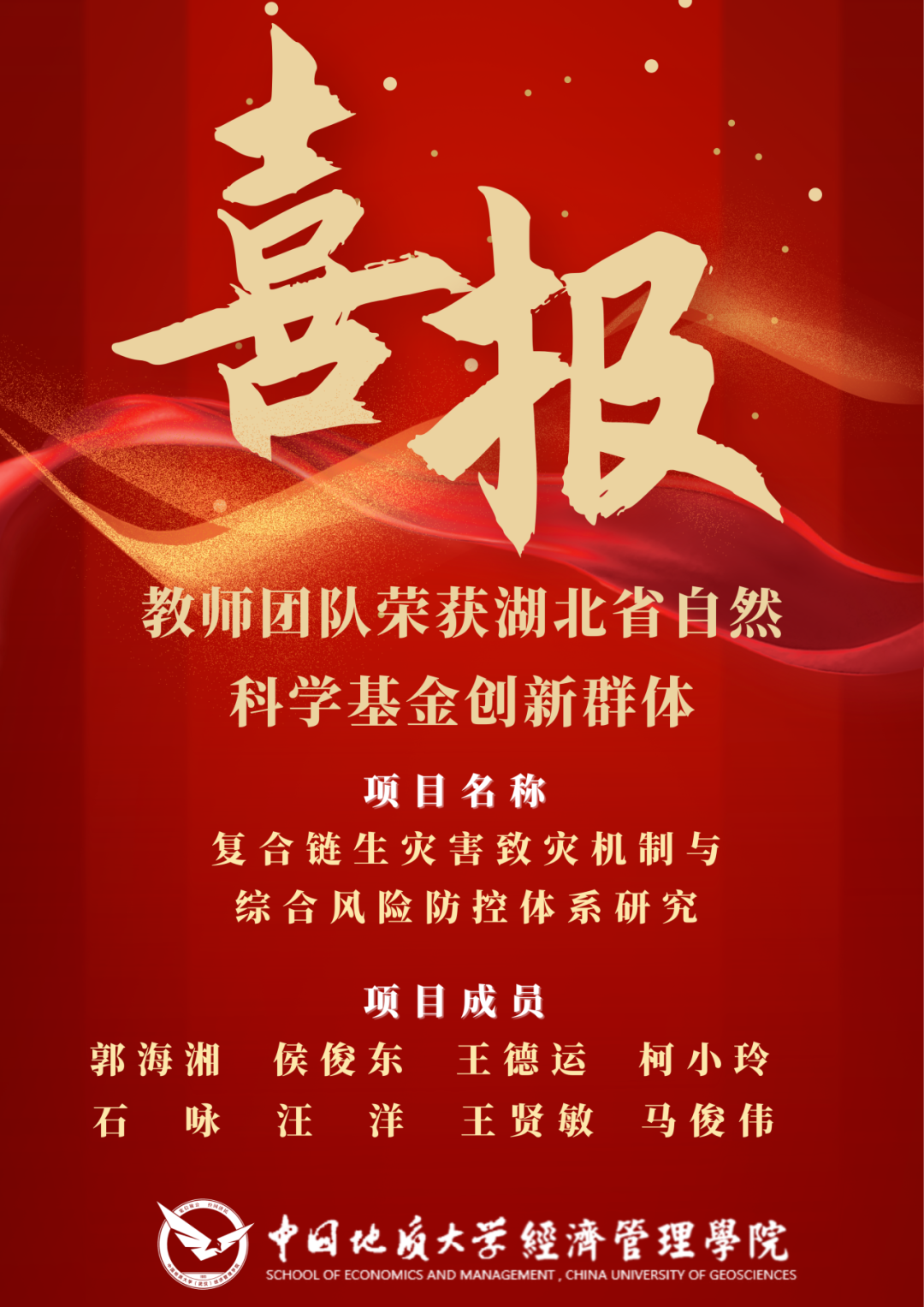 近日,湖北省自然科学基金获批名单公布,以公司郭海湘教授、侯俊东教授、王德运副教授、柯小玲副教授、石咏特任教授为核心的科研团队,协同工程公司汪洋教授、地球物理与空间信息公司王贤敏教授、湖北巴东地质灾害国家野外科学观测研究站马俊伟副研究员,共同申请的“复合链生灾害致灾机制与综合风险防控体系研究”,荣获湖北省自然科学基金创新群体项目支持,该群体项目是公司培育支持的复合链生灾害风险决策与应急管理交叉团队的重要成果,也是近年来公司获得的首个交叉学科湖北省自然科学基金创新群体项目。