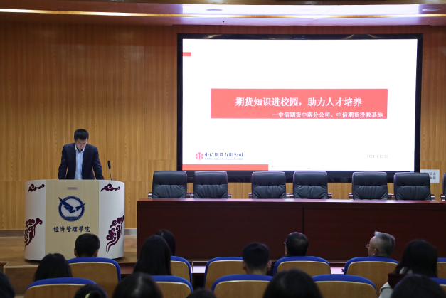 (通讯员:王德运 摄影:胡启婧)12月4日,中信期货有限公司中南分公司研究生联合培养基地揭牌仪式暨学术报告会在公司422会议室隆重召开。由中信期货董事总经理、研究所所长王稹、中信期货中南分公司党支部书记、总经理苏仲博、副总经理冯宇带队的8位企业代表,研究生院联合培养基地主管老师张妍,公司党委书记杨昌锐、党委副书记李纪亮、副经理程胜、大数据科学与应用统计系支部书记王德运、系主任李奇明及部分教师代表参加了基地授牌仪式。