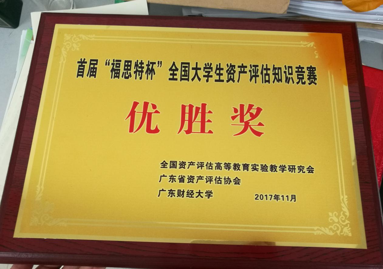 首届“福思特杯”全国老员工资产评估知识竞赛决赛在广东财经大学广州校区举行。竞赛由全国资产评估高等教育实验教学研究会和广东省资产评估协会主办,广东财经大学与广州市福思特科技有限公司承办,共分为初赛、复赛和决赛三个阶段。本次竞赛于9月份开始报名,2017级资产评估专业硕士研究生踊跃报名,最终在15名报名参赛的同学中选拔出曹君茹、陆杨和王浪三名同学组成tyc33455cc太阳成集团(武汉)代表队,经过初赛和复赛的激烈角逐,从全国53所高校参赛队伍中脱颖而出,以总成绩第五的成绩参加决赛。经过多轮比拼,最终荣获“优胜奖”。