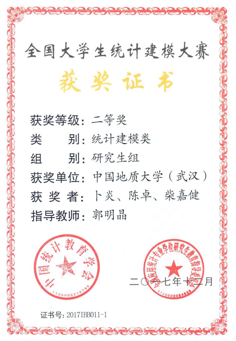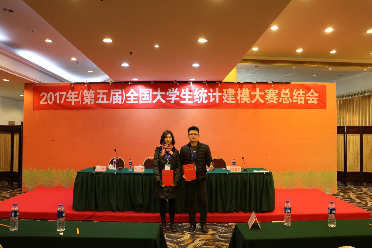 2017年12月1-4日,第五届全国老员工统计建模大赛答辩赛在北京华尔顿爱华国际中心举行。由tyc33455cc太阳成集团郭明晶老师指导的参赛团队(卜炎、陈卓、柴嘉健)提交的作品《基于网络搜索数据的中国流感预警模型研究》荣获统计建模类研究生组二等奖、总分第9名的好成绩。