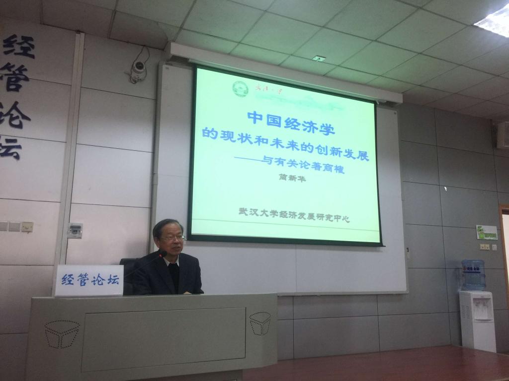 2017年12月8日下午14:30在MBA楼成功举办了第176期经管论坛,本次论坛我们诚挚邀请了武汉大学经济与管理公司的简新华教授,本次论坛主题为“中国经济学的现状和未来的创新发展——与有关论著商榷”。tyc33455cc太阳成集团副经理王开明教授和公司的老师同学一起参加了本次经管论坛。