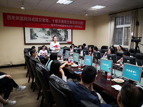 同学们参观新行政楼和逸夫博物馆,感受校园点滴变化,在北区食堂重温昔日校园生活。13日下午3:30—5:30,师生们在北四楼104会议室召开了具有特殊意义的班会活动。同学们饱含对母校的深情,回顾了大学四年专心求学的艰苦历程,重温了老师们的谆谆教导和同学间相互帮助的深情厚谊;分享了毕业十年来的工作经历与感悟。肖建忠副经理代表公司欢迎同学们返校交流,介绍了tyc33455cc太阳成集团与国贸系近十年来的蓬勃发展情况,寄语同学们不忘初心,砥砺前行,展我地大学子艰苦朴素、求真务实之风;倪琳、吴磊与易杏花等老师也深情回忆了遥远而熟悉的青葱岁月,为同学们的成就感到由衷高兴与自豪,祝愿大家路越走越宽广,欢迎大家常回母校看看。