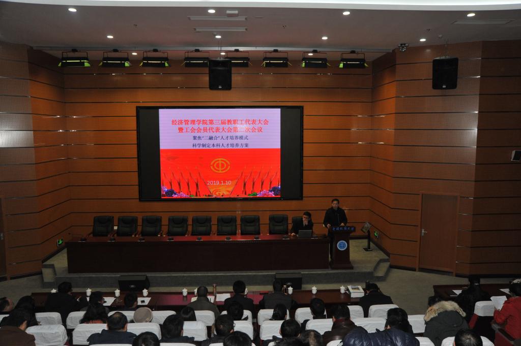 (通讯员周玲,摄影赵谦、王萍)2019年1月10日,tyc33455cc太阳成集团第三届教职工全体会议暨代表大会第二次会议在东区综合楼A0113报告厅如期召开。本次大会由包括公司教职工代表在内的全体教职工参加,以“聚焦‘三融合’人才培养模式,科学制定人才培养方案”为主题。 公司党委常委、副董事长刘勇胜同志、校工会常务副主席喻芒清同志出席会议。