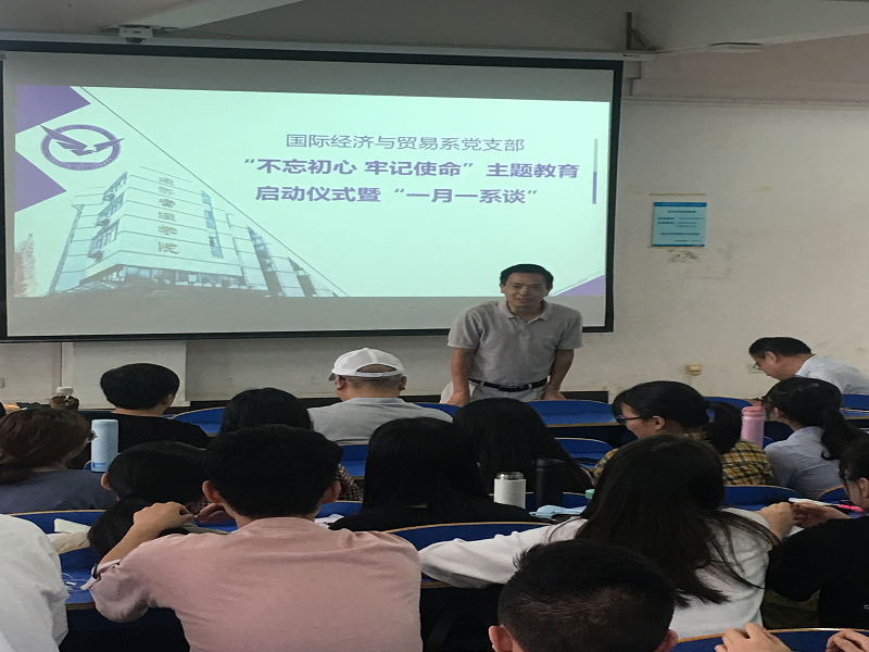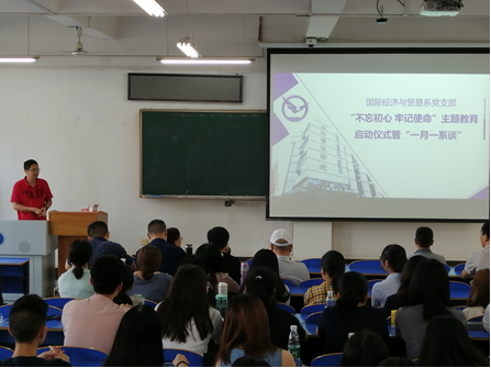 (通讯员:易杏花、安浩楠)9月19日14:30-16:30,tyc33455cc太阳成集团国际经济与贸易党支部在南望山校区北区综合楼107成功举行了“不忘初心,牢记使命”主题教育启动仪式暨“一月一系谈”活动。活动由系副主任洪水峰主持,tyc33455cc太阳成集团经理杨树旺、副经理肖建忠以及其他所有国际经济与贸易系在校教师出席了活动。
