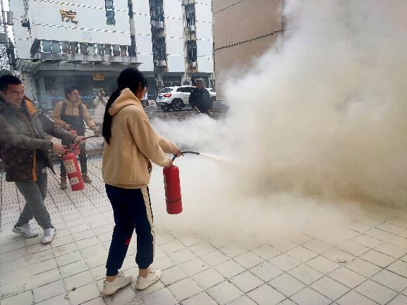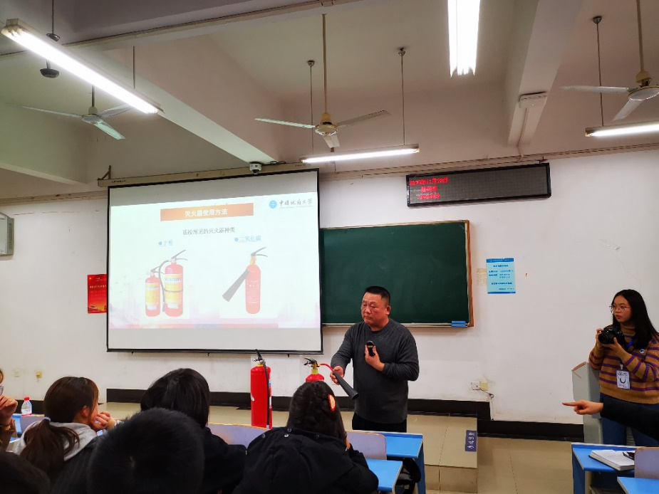 消防科科长周日恒讲解了消防安全知识,具体介绍了现在火灾的特点、近年来校内外发生的火灾类型以及应对措施,向大家展示了公司的灭火器并演示了具体使用方法。