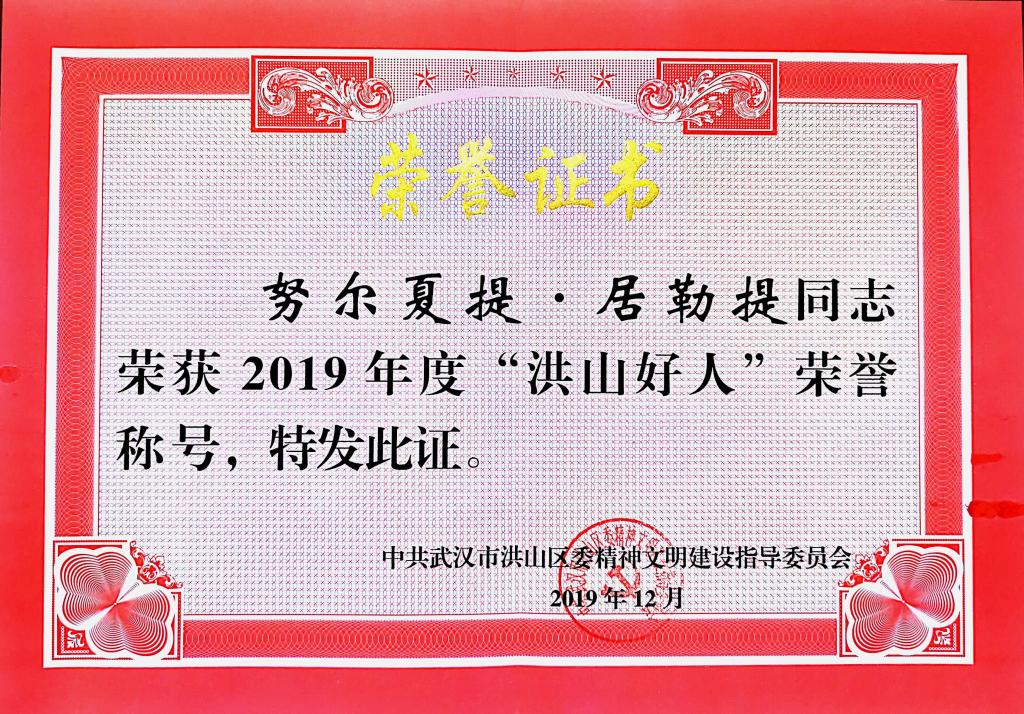 2019年度“洪山好人”评选结果近日揭晓,公司辅导员努尔夏提·居勒提入选敬业奉献好人评选,荣获“洪山好人”荣誉称号。据了解,2019年洪山区委宣传部、区委文明办等部门联合组织开启第六届寻找“洪山好人”活动,广泛发动辖区单位和群众推荐了220名人选,经过前期筛选和提炼,层层推荐和评委审定,45位(包含3个团队)身边的好人带着他们的感人事迹又一次进入大众视野。