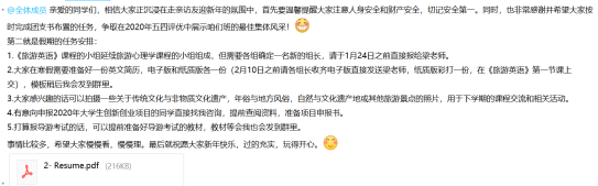 自公司发布2020春季教学方案部署,广大师生积极响应“停课不停教、停课不停学”的号召,沉着应对疫情,各项教学工作在2020.2.10如期顺利展开。为确保教学工作顺利进行,任课老师积极部署,提前制定教学计划,按照课程进度有条不紊进行教学,稳步进行疫情期间远程教学工作。结合《旅游英语》教学安排,在假期提前布置适当的寒假作业,以期同学们充实愉快地迎接新学期。从开学前的反馈情况来看,对员工的督促作用比较明显。