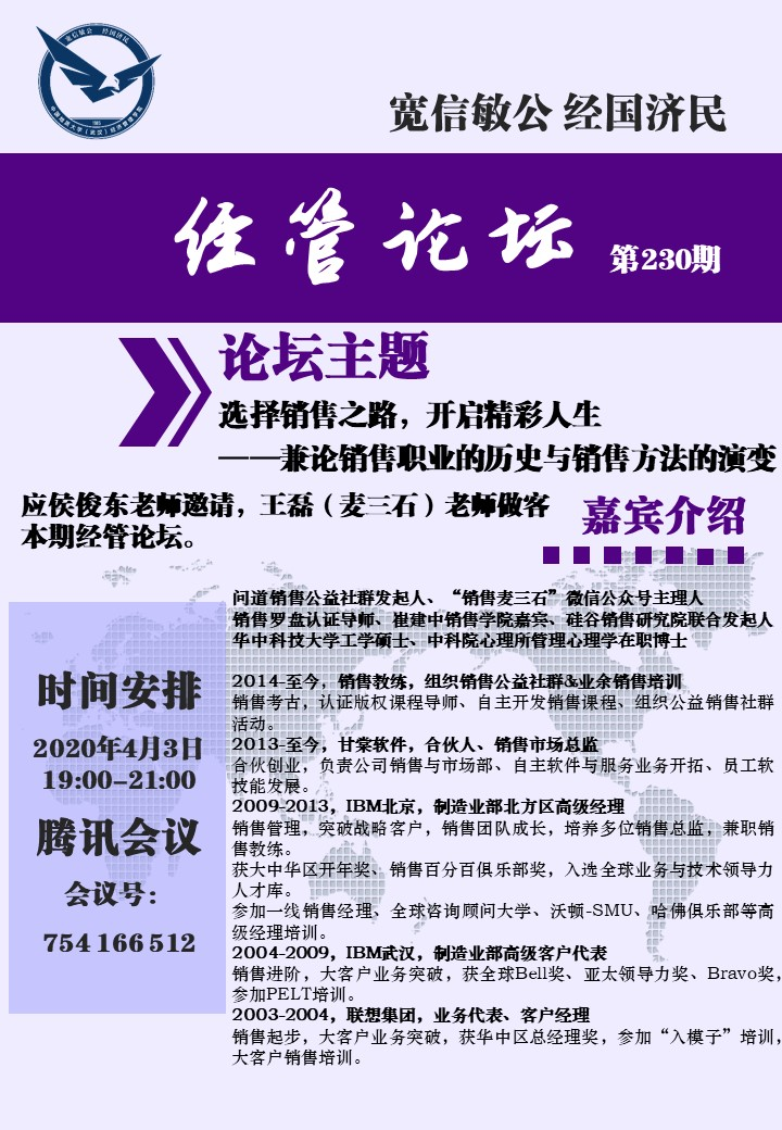 (员工记者郭振华)4月3日晚,230期经管论坛在腾讯会议平台如期举办,应工商管理系侯俊东老师邀请,资深销售教练王磊老师做客本期论坛,为同学们展开“选择销售之路开启精彩人生”的主题讲座。工商管理系主任刘家国、系支部书记刘耕等老师与百余位工商管理系学子参与论坛交流,辅导员努尔夏提•居勒提老师主持活动。