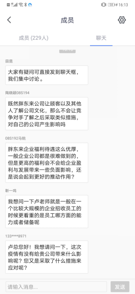 交流环节中,工商管理系教师与卢鹏老师一同就胖东来集团的商业伦理、公司文化、经营管理、突发事件应对、员工求职选择、能力培养等问题与同学们展开积极讨论。