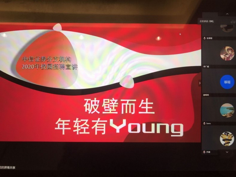 在经验分享方面,员工兴业银行周奔经理结合自身经历为同学们剖析了考研与就业的机会成本,介绍疫情期间国家出台的老员工就业政策,鼓励同学们找准定位,认清自身情况,积极主动就业,他分享的观点获得与会师生的广泛认同。中信证券郑屹经理介绍了中信证券的主要业务及招聘政策,为同学们进行了一次在线招聘宣讲。钟丽华主管介绍了具体的薪酬待遇政策,鼓励大家抓住最后的校园招聘机会。