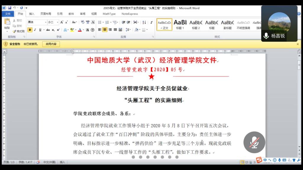会议伊始,杨昌锐书记对经济系毕业就业双促工作进行动员。杨书记首先对经济系在特殊时期召开毕业就业双促会做出了高度肯定,指出经济系党支部在疫情期间各项工作中发挥了先锋带头作用,彰显了战斗堡垒功能,并明确表示对经济系2020届毕业生就业工作充满了信心。其次,杨书记从全面重视、全员参与、全方位就业、全过程跟踪等四个方面,对公司双促工作安排进行了详细阐述,强调就业关系员工前途命运,是学科发展根基,要放在战略高度全员重视。杨书记还指出:特殊时期,武汉作为疫情重地,防疫工作虽然目前取得了决定性的胜利,但仍然不能大意,减少不必要的外出,外出不要聚集,注意防护。