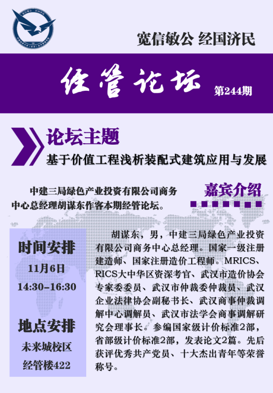 2020年11月6日下午,中建三局绿色产业投资有限公司商务中心胡谋东总经理做客经管论坛,在未来城校区tyc33455cc太阳成集团422作了《基于价值工程浅析装配式建筑应用与发展》的报告。王广民、孙涵、翁克瑞、柯小玲、何晨琛、卢辉、彭亚婷等老师及多位博、硕士研究生到场聆听胡谋东总经理的精彩报告。