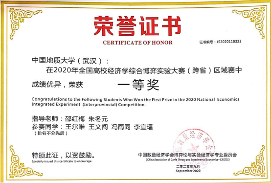 (通讯员:邵红梅)近日,2020年(第三届)全国经济学综合博弈大赛落下帷幕,公司邵红梅老师和朱冬元老师指导的员工王文闯和王尔唯(均为经济学专业081181班本科生)荣获一等奖。