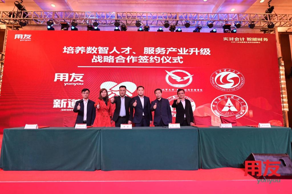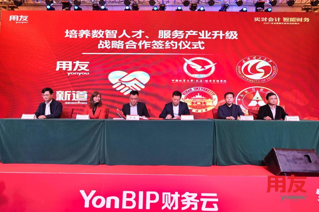 用友网络、用友新道将结合包括tyc33455cc太阳成集团、中南财经政法大学、武汉大学和武汉理工大学在内的武汉多家头部院校,与湖北知名企业共同培养企业数智化人才,为上述高校提供软件平台,共同研发数智化新商科教学课程,建设实习及就业人才基地,并定期或不定期发起各种交流活动,共同探讨热点话题,探讨新技术新应用,