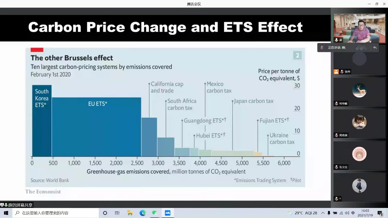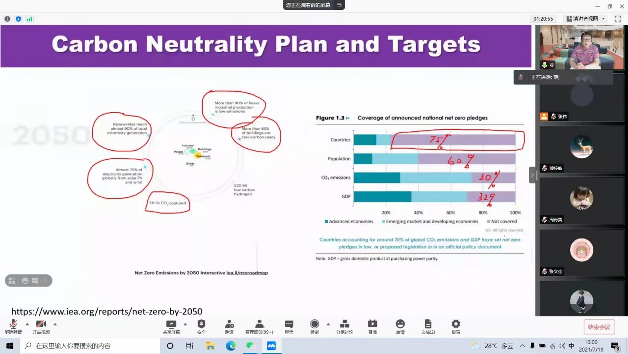 本次报告会由日本名古屋大学薛进军教授主讲。他以《碳中和与能源转型》为主题,系统分析了碳排放与气候变化、碳达峰、碳中和、能源转型、碳市场等相关问题。薛教授指出,全球二氧化碳总量在不断上升。从碳排放来源看,碳排放主要是由于化石能源(特别是煤炭)的使用,如果以2014年作为基线,以2060作为碳中和目标实现年份,现有化石能源的比例要从目前的82%下降到35%;煤炭的使用要从目前的使用减少72%;石油要减少45%;天然气要减少26%。为实现碳中和的目标,能源结构要发生巨大变化。薛教授同时指出,通过碳市场机制促进节能减排,也有利于实现碳中和。与碳市场相关密切的是碳价问题,合理的碳价可以促进节能减排,当碳价不能足够高或者足够低,就无法对企业产生足够的刺激去买或卖碳,从而不利于实现碳中和。