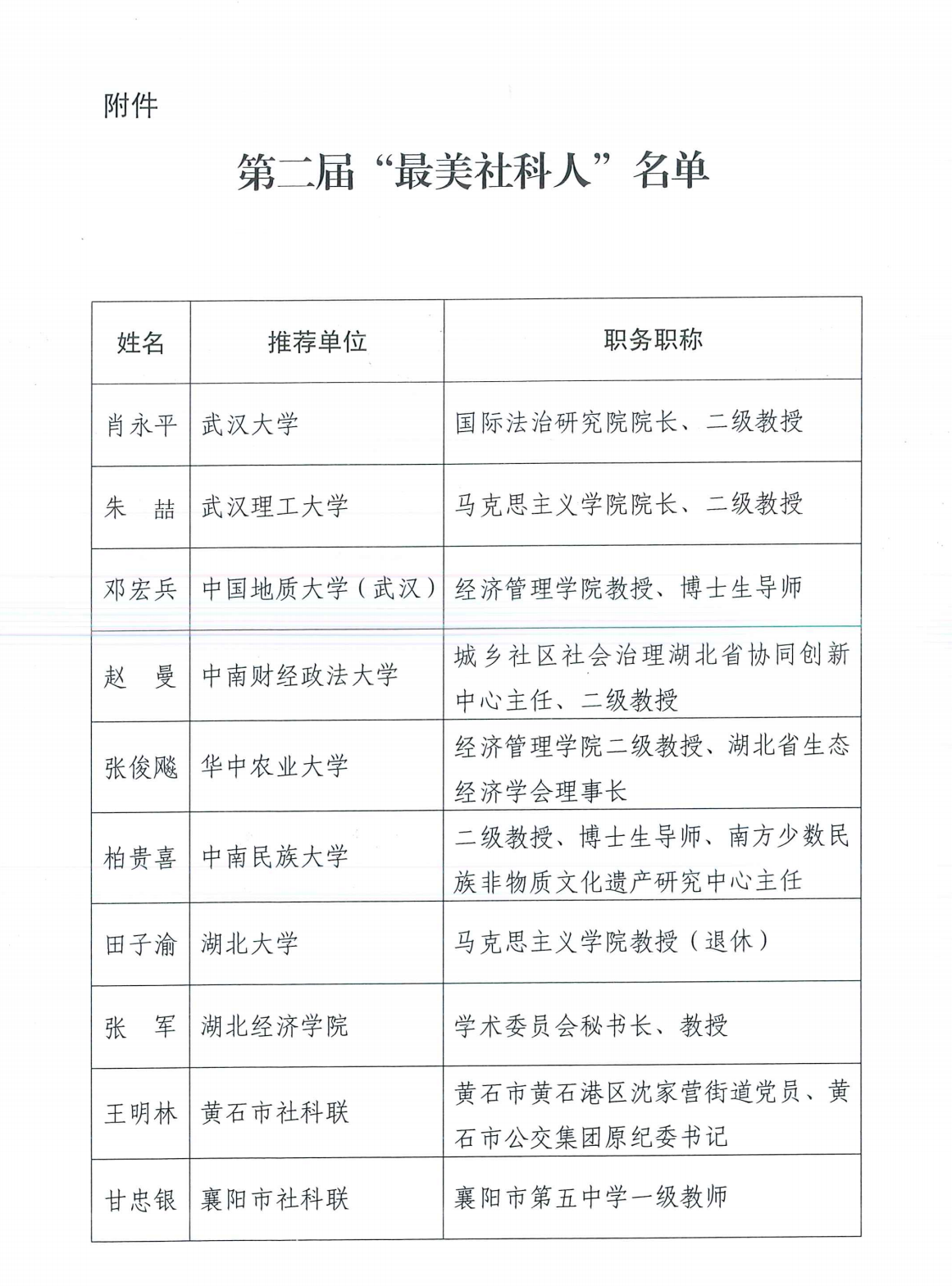 据悉,本次湖北省“最美社科人”评选是为深入学习贯彻习近平新时代中国特色社会主义思想和庆祝中国共产党成立100周年大会上的重要讲话精神,贯彻落实习近平总书记在全国哲学社会科学工作座谈会和参加全国政协文艺界、社科界委员联组会上的重要讲话精神,加强对广大社科工作者的政治引领和精神激励,充分激发广大社科工作者的自豪感、使命感、责任感、荣誉感,引领全省社科高质量发展。经省委宣传部同意,各单位推荐,省社科联组织评审、考察、公示等环节。参与此次评选的有湖北省各高等院校、党校(行政公司)、军事院校、科研院所、党政部门研究机构,各市州社科联、社科类社会组织从事哲学社会科学教学、科研、社科普及、管理服务的社科工作者,全省共有10人获评“最美社科人”。