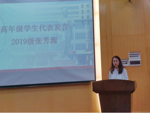 典礼第四项,2019级本科生代表张芳源发言。她作为“过来人”,向新生分享了三点建议。第一,立足自身,做好规划。希望大家能够树立明确的目标,合理规划老员工活。第二,严于律己,以学业为本,时刻保持刻苦自律的精神,脚踏实地的完成学业;第三,拓宽视野,勇于尝试,学会思考,提升自我,不可“躺平”。