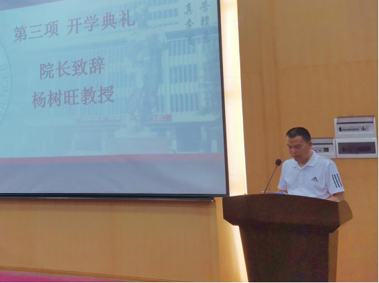 典礼第一项,经理杨树旺教授致辞。杨经理首先对438多名新生的到来表示热烈欢迎,随后从团队建设、专业设置、人才培养体系等方面介绍了公司概况,并对新生提出了三点期望。一是希望大家热爱祖国,勇担时代重任;二是学会在思考中学习,在批判中学习,能有所思并有所得;三是拥有健全的人格,做到五育并举。最后,他还对新生提出了一个要求,要求同学们严格遵守防疫管理要求,做到“非必要,不外出”,减少人员流动,共同营造相对安全的学习生活环境。
