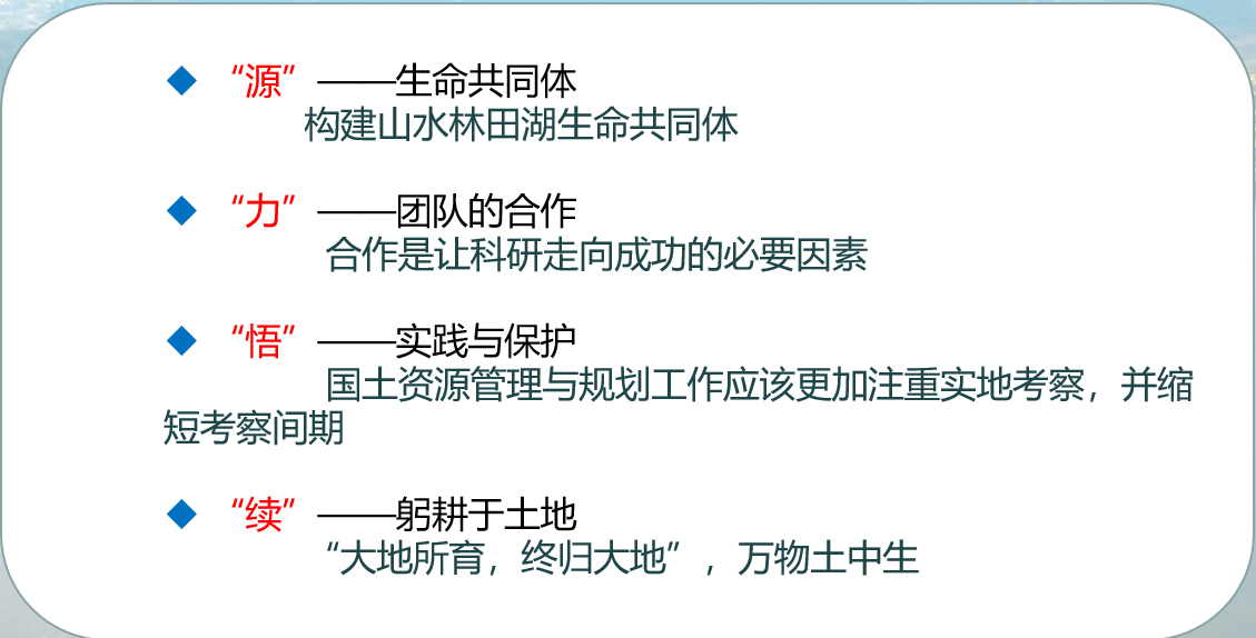 队员们在比赛中体会到了自然是生命之“源”,我们需要不断构建生命共同体,以系统观念推进山水林田湖草沙综合治理;“力”就是指齐心协力,唯有心往一处想,劲往一处使,才能更好地完成调查工作;”悟“就是在实践过程中要主动思考,心有所悟,自然资源管理更应注重实践,缩短考察时间才能更好地应对快速变化的国土空间开发规划;最后,队员们一起立志扎根土地,躬耕土地,一起”续“写土地国情调查华丽新篇章。