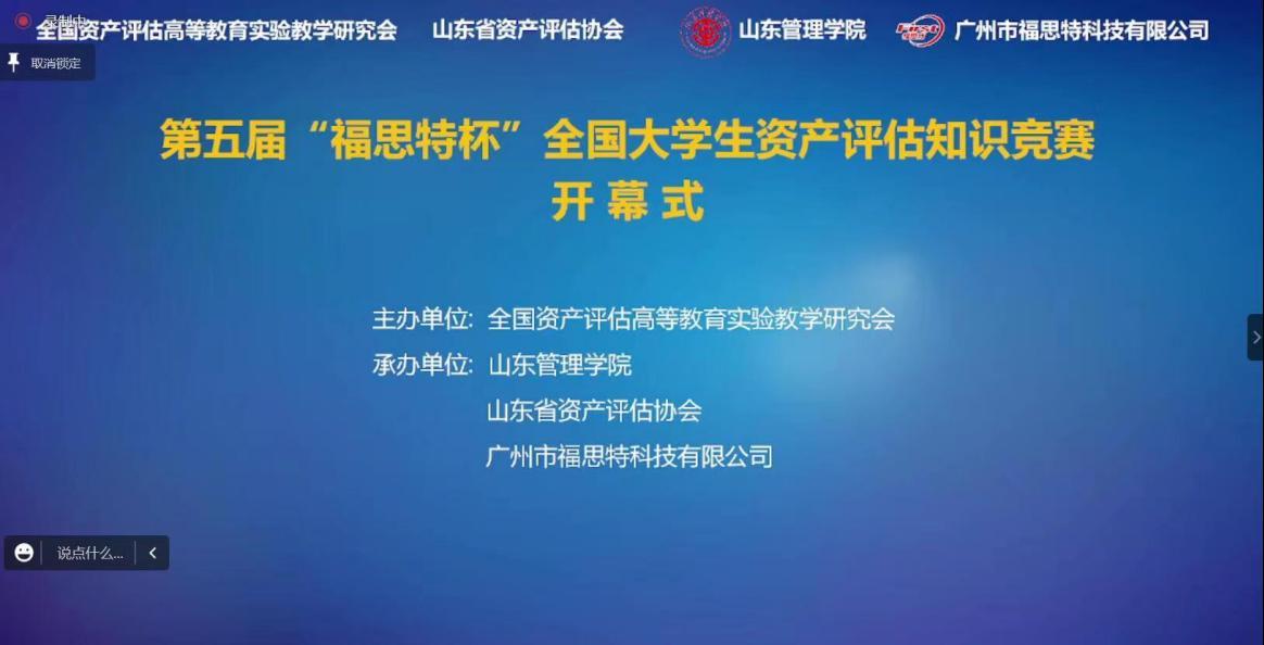 第五届“福思特杯”全国老员工资产评估知识竞赛由中国资产评估协会指导,全国资产评估高等教育实验教学研究会主办,山东省资产评估协会、山东管理公司、广州市福思特科技有限公司为承办,本着“以赛促教、以赛促学、以赛促改、以赛促管”的目的,比赛分为三个阶段初赛、复赛和决赛,经过初赛和复赛,在全国105支代表队中筛选出了40支队进入决赛,决赛共分两个阶段,第一阶段为基本能力决赛,采用机考的方式进行,由40支队伍中选拔16支队伍进入综合素质决赛,再在16支队伍中选拔一二三等奖。本次比赛根据疫情防控需要,采用线上进行,选手们在线答题,腾讯会议直播。