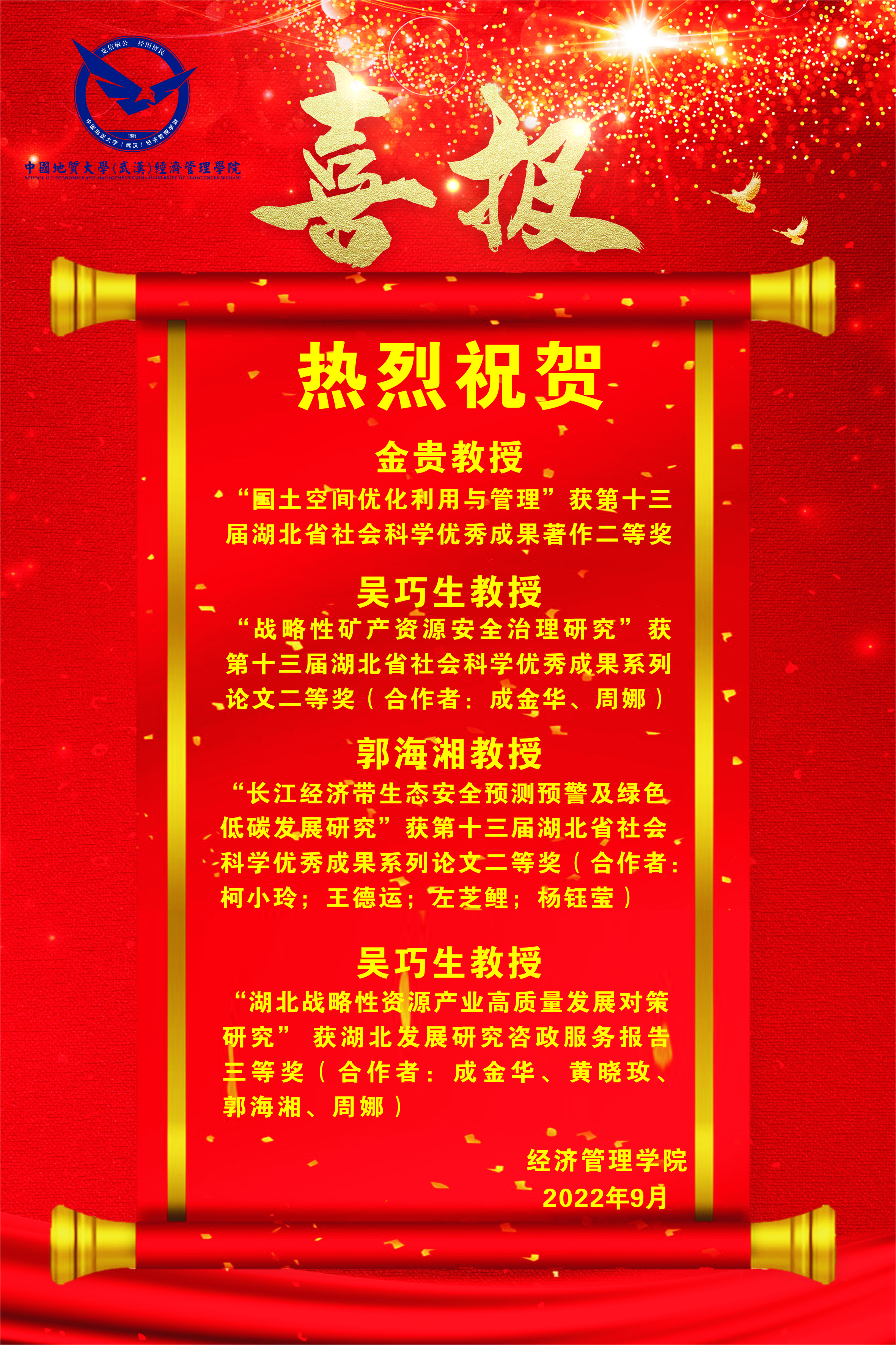 近日,第十三届湖北省社会科学优秀成果奖获奖名单和湖北省发展研究奖(2020—2021年)获奖名单公布,公司共获得一等奖1项,二等奖4项,三等奖5项。其中,公司吴巧生教授、金贵教授、郭海湘教授分别获第十三届湖北省社会科学优秀成果二等奖,吴巧生教授获湖北发展研究三等奖。