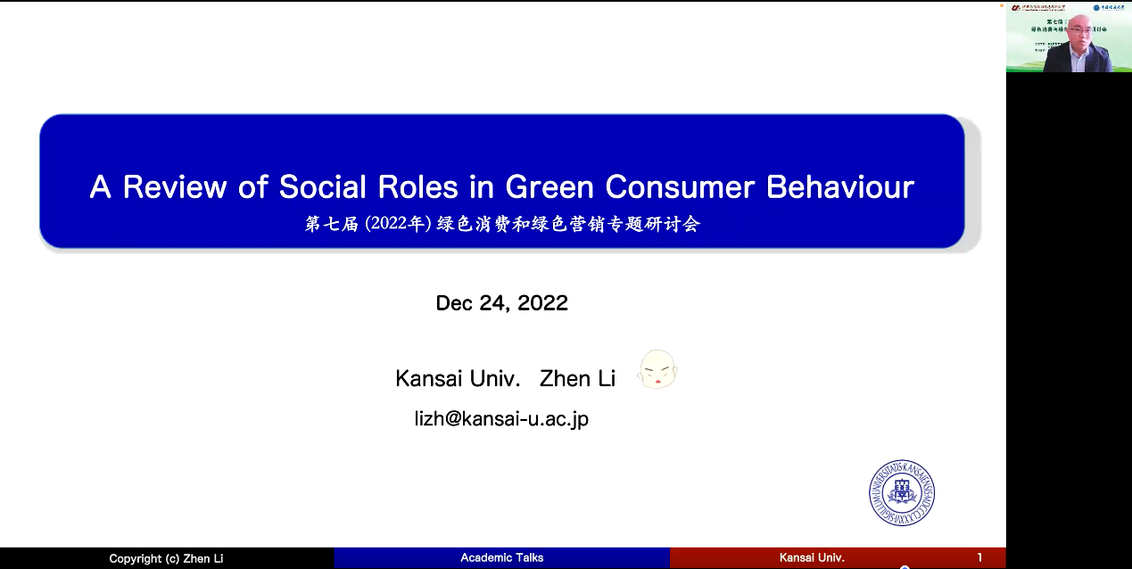12月24日上午,以“绿色消费与绿色营销”为主题的报告中,各位专家带来了丰富的学术盛宴。江苏大学管理公司杜建国教授做了题为《供需协同视角下绿色消费行为促进机制》的分享,为大家打开了绿色消费行为研究的新视角。对外经济贸易大学国际商公司孙瑾教授做了题为《营销视角下可持续性消费相关研究“碳”索》的报告,从营销视角下分析可持续消费的背景、进展和未来发展方向。华中科技大学管理公司常亚平教授做了题为《谈谈“双碳”的商业机会》的报告,从营销视角分享实现“双碳”目标的商业机会和研究可能。日本关西大学商公司李振教授和做了题为《A review of social roles in green consumer behavior》的报告,分享了社会角色在消费者绿色消费行为的作用的文献综述。