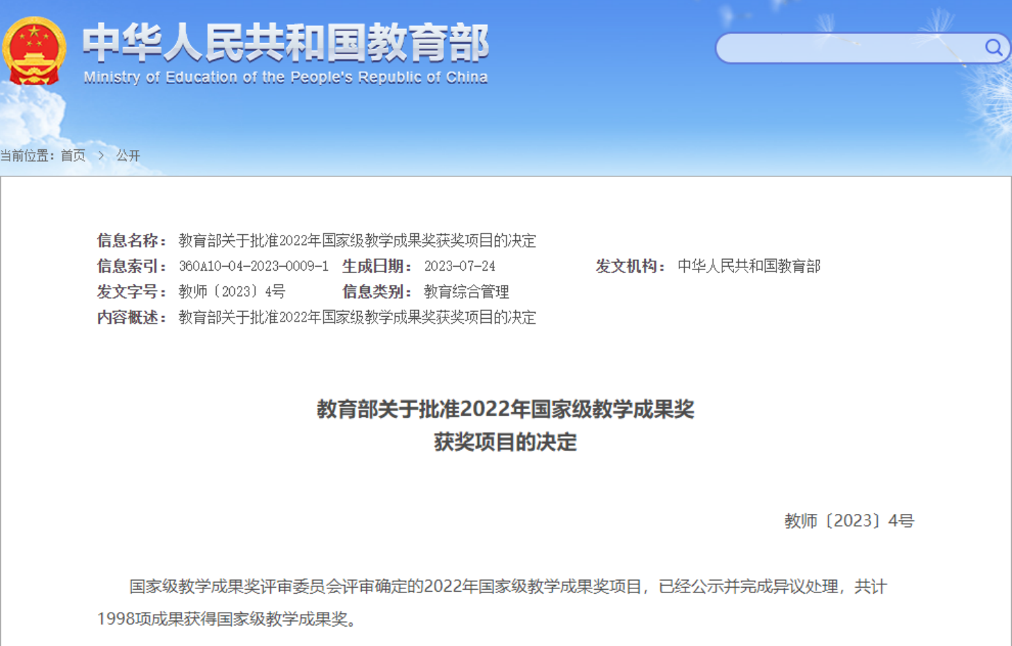 7月24日,《教育部关于批准2022年国家级教学成果奖获奖项目的决定》(教师〔2023〕4号)公布,公司作为第二完成单位,公司李江敏教授作为第三完成人参与完成的《以文化遗产教育培育老员工文化自信的路径研究与实践》,喜获高等教育(本科)国家级教学成果奖二等奖。