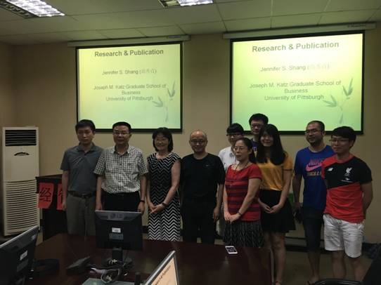 2016年7月6日,美国匹兹堡大学教授Jeniffer Shang应公司严良经理和郭海湘教授邀请,于下午3时在MBA104与tyc33455cc太阳成集团各位师生进行学术交流,作了题为Reaearch&Publication的精彩报告并以问答的形式与各位师生进行了更进一步的讨论。严良经理,王开明副经理等出席会议。