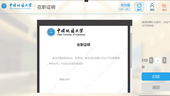 预览即将打印的证明内容,确认无误后,点击打印。由于使用的是彩打一体机,打印时间预计20秒左右,在打印过程中,请勿离开。