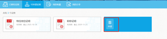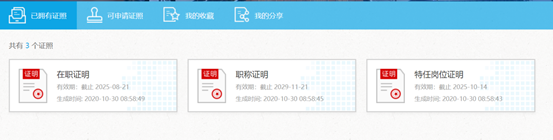 查阅步骤(1)申请成功的证照。证照格式为PDF文档,可查看、下载、分享、发送邮件。在“已拥有证照菜单”下的证明才能在一体机上实现自助打印,如下图所示: