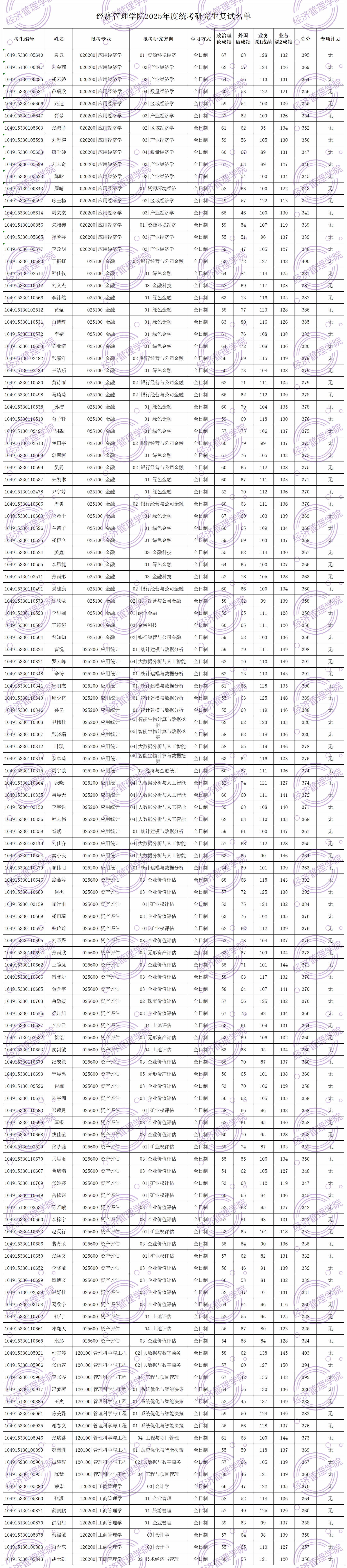(专业代码)专业名称 | 政治 | 外语 | 业务课一 | 业务课二 | 总分 |