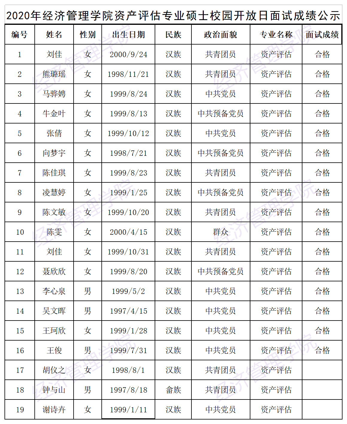 2020年tyc33455cc太阳成集团资产评估专业硕士校园开放日面试成绩公示