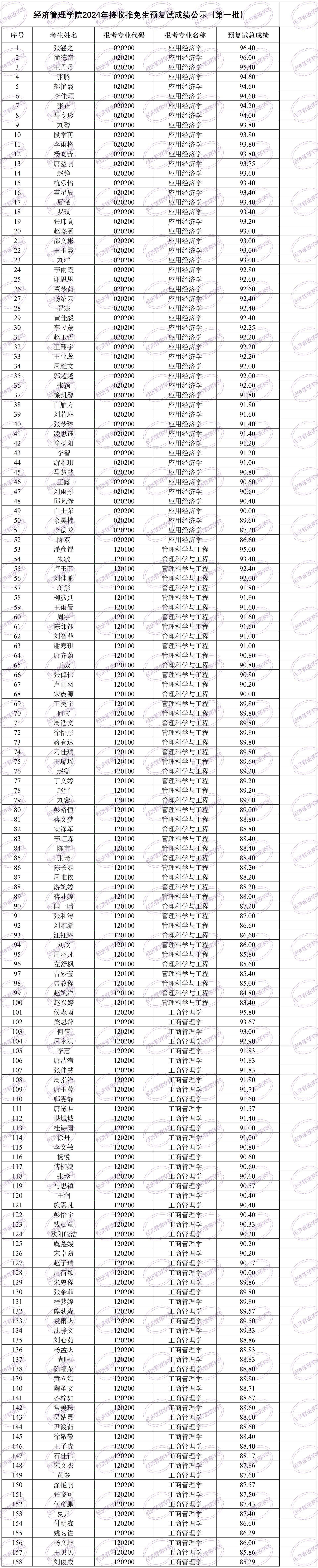 按公司相关文件规定,现对公司2024年接收推免生预复试成绩予以公示(详见附件)。公示期为2023年9月29日—10月3日。公示期内如有异议,请书面申述。联系人:王老师,电话027-67883204,邮箱360655881@qq.com。