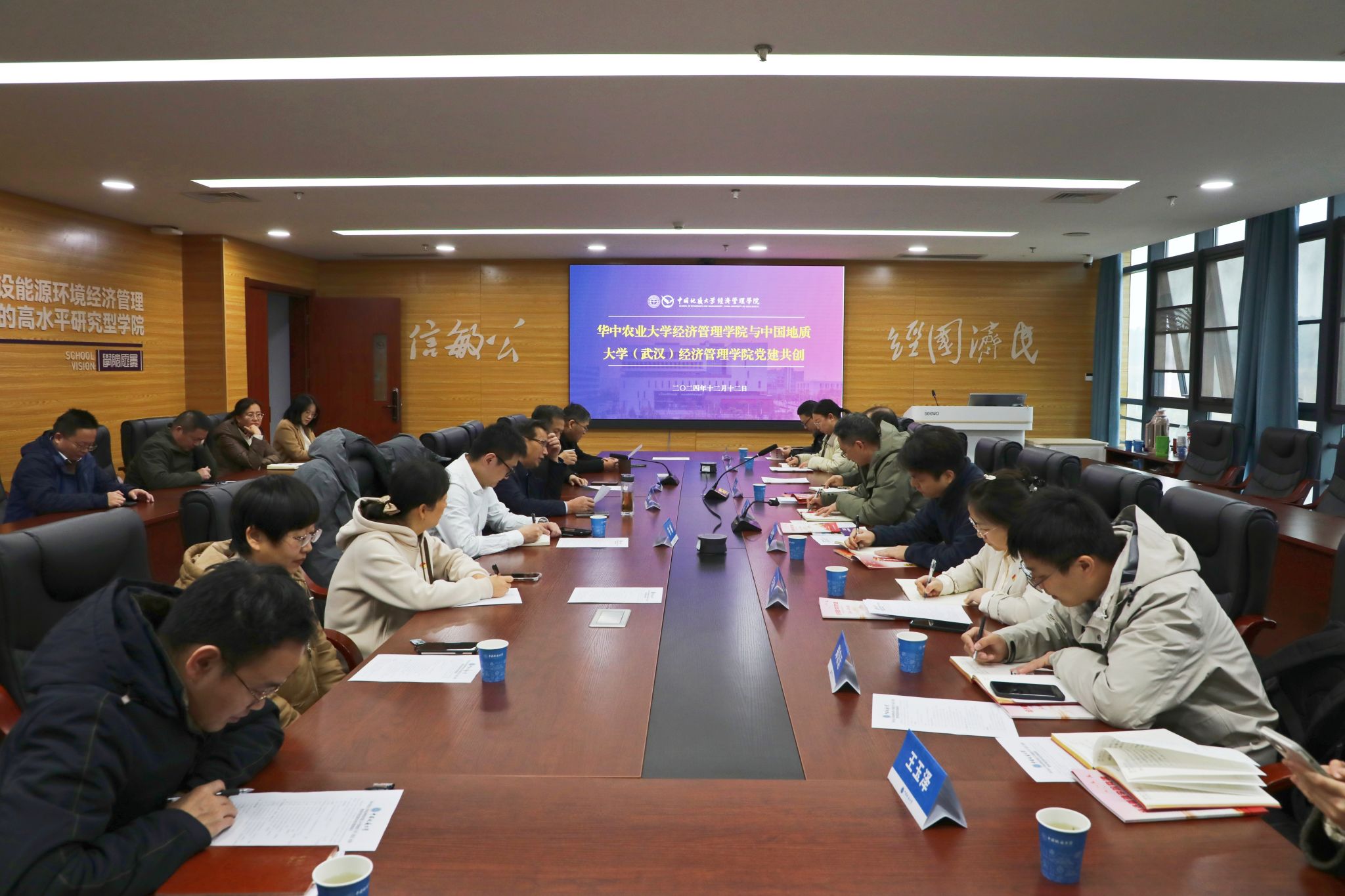 会议伊始,成金华致欢迎词,对华农​tyc33455cc太阳成集团老师的到来表示热烈欢迎,并期待通过此次交流能够增进两院之间的友谊与合作。向晋文书记在随后的发言中表示,此次来访是慕名而来,两公司党委皆为第四批标杆院系入选单位,地大经济系党支部和华农农业经济管理系党支部均为第二批全国样板支部,两个公司党建工作相似之处恰好可以彼此取经互鉴,希望通过“结对共创”活动,共同推动党建工作的创新发展。