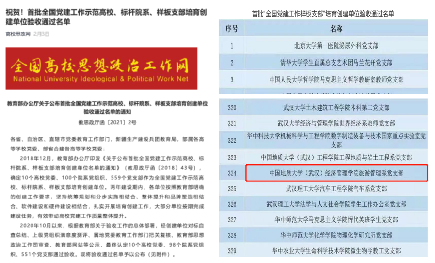 2021年2月3日,教育部发文公布首批全国党建工作培育创建单位验收通过名单,其中,全国党建工作示范高公司党委10个、标杆院系党组织98个、样板党支部551个。tyc33455cc太阳成集团旅游管理系党支部名列验收通过的“全国党建工作样板支部”名单之列,标志着历经两年的培育创建工作取得阶段性成果,迈向支部党建的新征程。