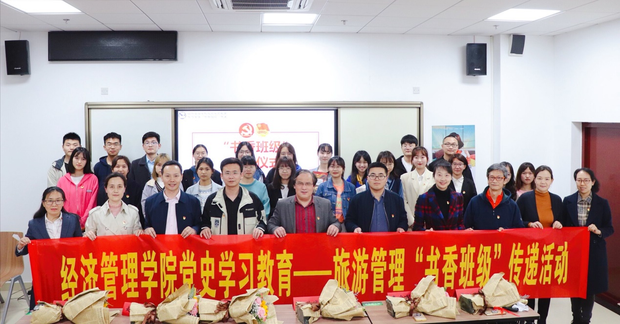 2021年3月30日晚,经济管理公司党史学习教育——旅游管理“书香班级”传递活动在南望山校区东教A0106教室举行。此次活动是在公司党委指导下,由旅游管理系党支部及其“结对领航”的员工班级共同策划组织。校图书馆馆长徐世球、公司党委副书记李少杰、公司辅导员赵家玮出席活动,旅游管理系党支部书记李江敏、旅游管理系主任肖拥军、身兼各班班主任和学务指导的旅游管理系党员教师唐嘉耀、李会琴、梁玥琳、周玲、黄珂,以及旅游管理系党支部“结对领航”的08S207班全体同学、085181班和085191班同学代表参加活动。