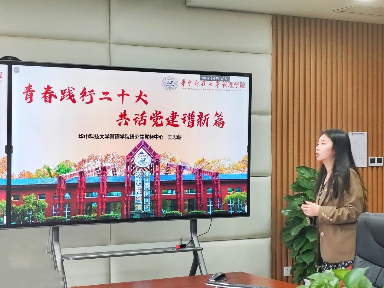 青春践行二十大,共话党建谱新篇。接下来,王思蕲介绍了华中科技大学管理公司研究生党务中心的组织逻辑和特色活动。该中心以“聚焦立德树人,创新党建模式”为理念,制定组建管理思路,结合公司支部具体建制情况,科学构建了“辅导员—党建德育助理—党务中心—支委会—员工党支部”五级责任制度和反馈机制。她指出立德树人是高校的根本任务,党建育人是高校育人重要抓手,高公司党建工作要坚持以习近平新时代中国特色社会主义思想为指导,深入贯彻落实党的二十大会议精神,紧紧围绕立德树人这一核心,探索创新党建育人新模式,培养德智体美劳全面发展的社会主义建设者和接班人。