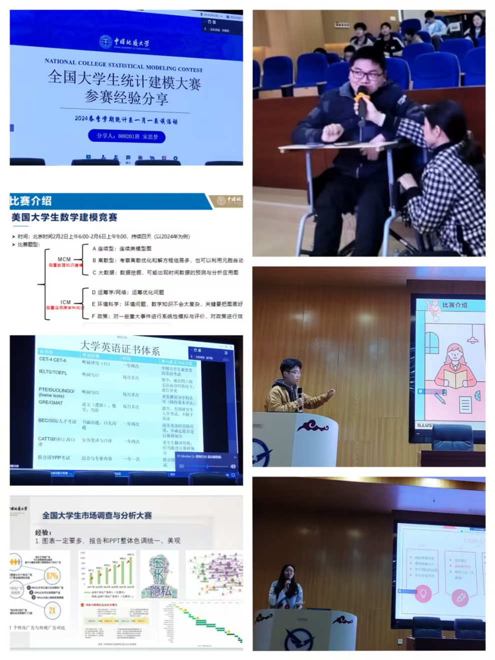 活动共分为三个部分:第一部分是邀请七位统计学专业同学分享学科竞赛和创新创业项目申报经验;第二部分是张弛老师介绍公司奖励办法并鼓励大家积极参加比赛;第三部分是师生交流。