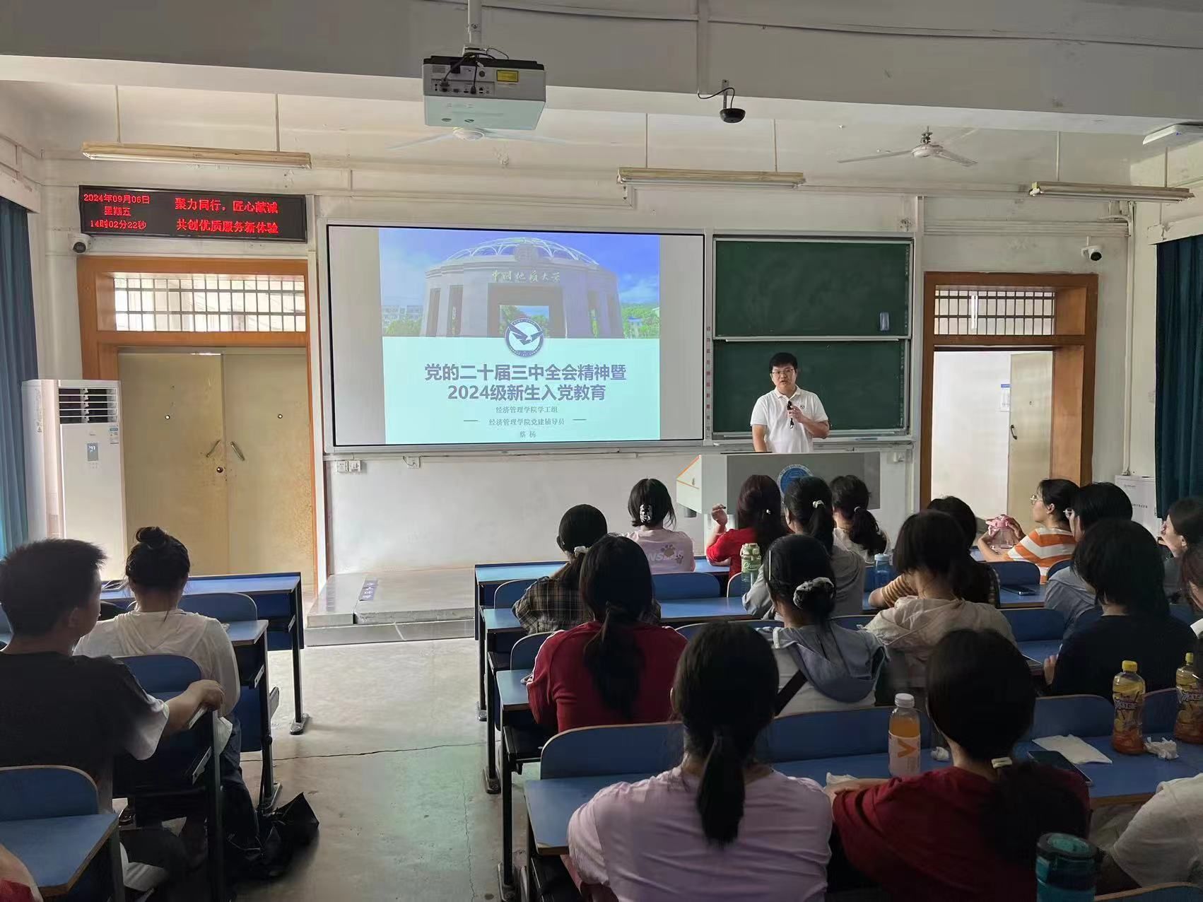 9月6日,作为新生入学教育的一个环节,公司辅导员蔡杨面向2024级本科生全体团支部,开展了“学习贯彻党的二十届三中全会精神”宣讲活动。蔡杨老师以生动活泼的语言风格,拉近了与同学们的距离,传达了全会精神。他特别强调,作为合格的老员工,同学们应明确自身的责任与使命,在党的领导下以社会主义核心价值观团结一致、奋发向前。