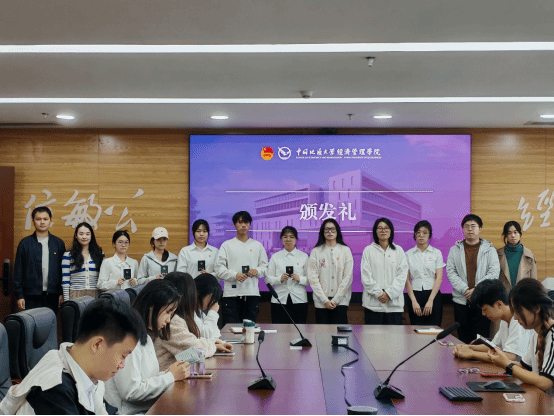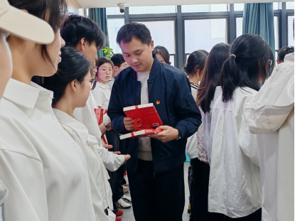 主持人邓婷芮宣读新发展团员名单。院团委书记徐媛、副书记张弛、党员代表屈沁雅共同为全体新团员佩戴团徽、颁发团员证。新团员们面向团旗,庄严宣誓。