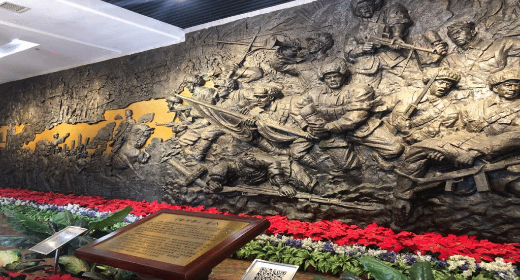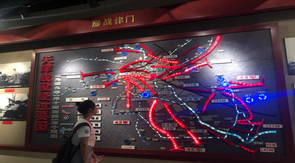 明我初心,寻役问津,我们来到革命烈士纪念馆,首先看到的就是《海河祭》,紧接着是鏖战津门时各路军从四面八方解放天津的路线图,以及发动总攻时的短片和模拟指挥部,一个个模拟的战争场面让我们体会到了中国军队那种势如破竹的强大,也仿佛看到了战士们前赴后继的惨烈。