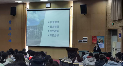 会议伊始,徐天宜老师简要回顾了同学们丰富的假期生活,现场气氛活跃。随后,她指出,假期生活已经结束,新学期、新起点,大家也要有新奋斗、新作为。接着,徐老师从疫情防控、日常管理、学务教务、考情分析四个方面展开会议。