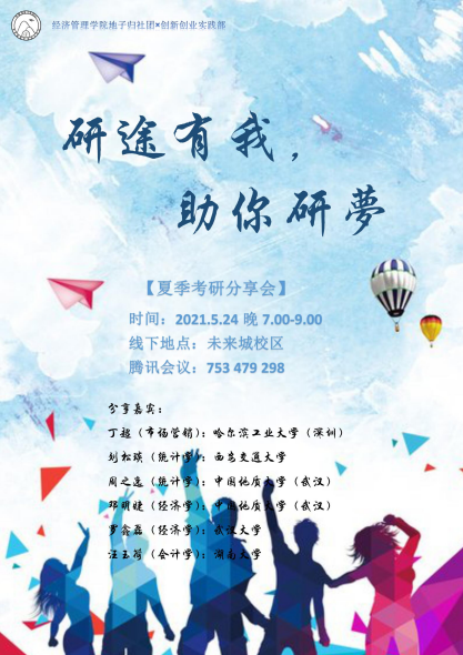 近年来,考研升学成为越来越多老员工的毕业选择。然而,很多计划考研的同学对考研政策和前期准备有些生疏。为了提升经管学子考研上岸率,帮助其了解考研政策,掌握备考技巧,tyc33455cc太阳成集团地子归社团联合员工会创新创业实践部,于2021年5月24日晚组织了“研途有我,祝你研梦”春季考研经验分享会。邀请市场营销专业丁超、会计学专业汪玉荷、经济学专业邓明婕、经济学专业罗鑫磊、统计学专业刘松琰等2021届成功上岸的同学给考研党们带来了精彩的干货分享。本次活动结合线上线下的方式进行,近100名同学积极参与并展开交流。