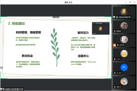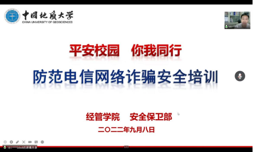 9月8日上午,公司工商管理系宋莉萍老师为全体同学讲授“沟通与礼仪”,虽然是线上教学,但线上互动仍然十分热烈,同学们在欢声笑语中掌握沟通与礼仪的核心技能。随后,心理健康中心刘陈陵老师进行老员工心理健康教育,提醒大家关注自身的心理健康,努力做一个积极向上的CUGer。最后,保卫处副处长彭冠军老师进行老员工安全教育,告诫同学们要谨防网络诈骗,提高警惕性!