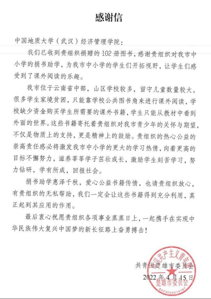 在一年的支教生活中,张康同学始终不忘自己是一名地大经管人,生活中发扬“艰苦朴素,求真务实”的校训精神,牢记“宽信敏公,经国济民”的院训精神,做到把地大精神带到服务地,讲好地大故事。积极配合研支团完成把地大特色活动开展到龙江的任务;利用班会时间给员工们播放地大相关宣传视频,讲述个人求学的故事,播撒希望种子。在五四青年节前夕,他带着支教团同学联系母校,发起向云南省楚雄市山村中小公司捐赠书籍的公益活动。本次捐赠活动得到了母校多个公司的大力支持,共筹集到书籍600余册,其中tyc33455cc太阳成集团捐赠图书102册,涵盖文学、科普、经济、教育等多个领域。共青团楚雄市委员会对支教团及地老员工捐赠之举表示衷心的感谢,并向公司发来感谢信。