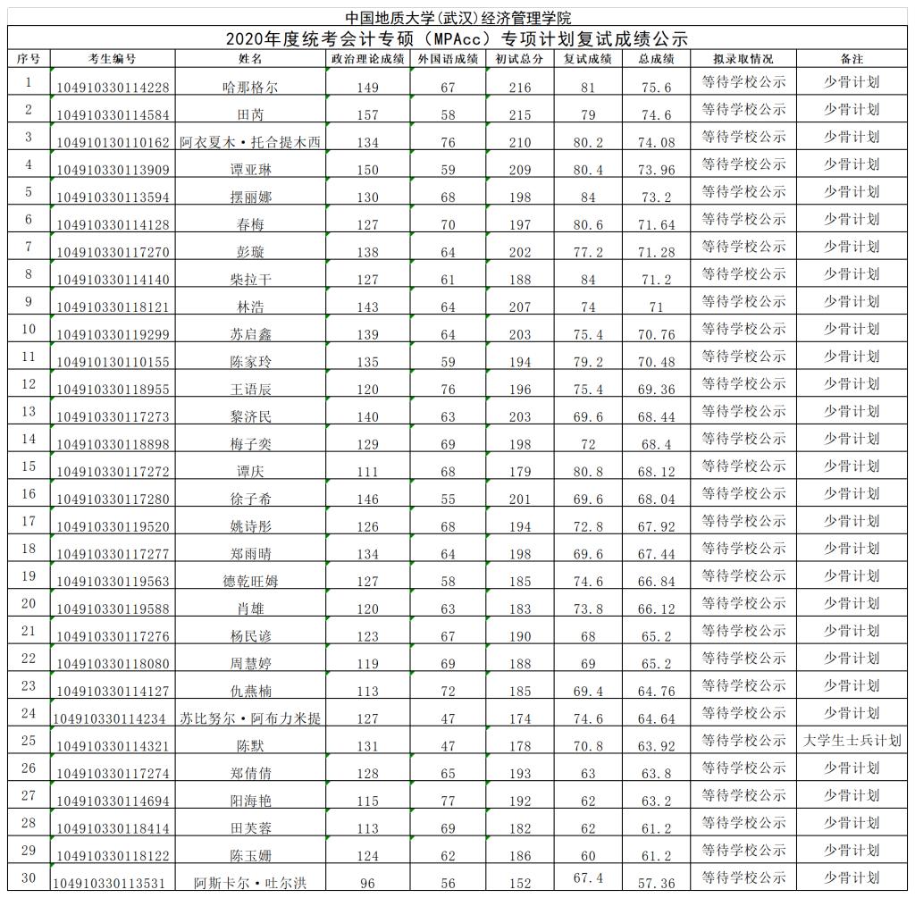 2020年度统考会计专硕(MPAcc)专项计划复试成绩公示